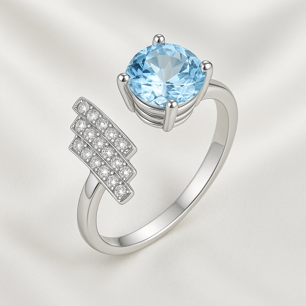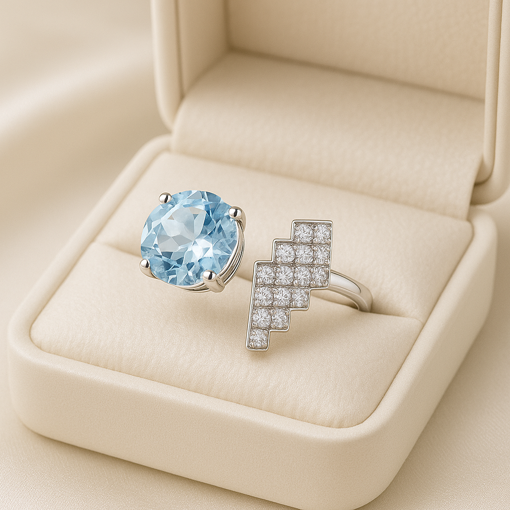 Delicately bold, Aelith captures the essence of contrast—soft serenity in a round aquamarine, set beside a modern arc of square-cut crystals that shimmer with quiet certainty. Crafted in luminous silver, the open band design brings balance between clarity and mystery, water and sparkle.