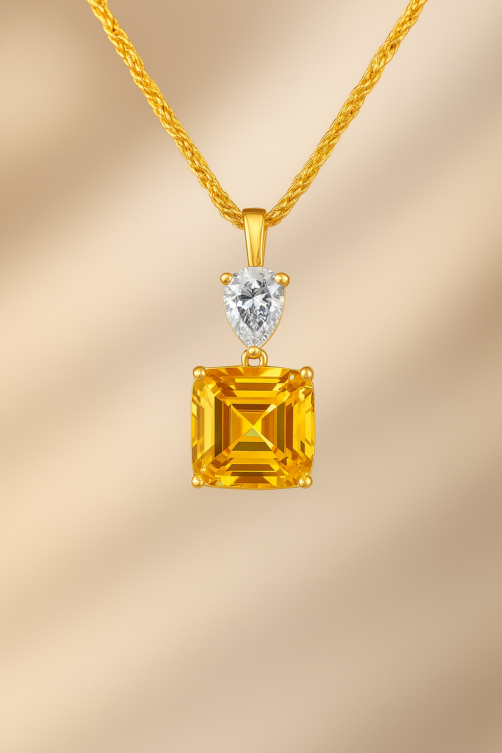 Radiant and uplifting, Caela glows with the warmth of a golden sunrise. A square-cut natural citrine forms the heart of the piece—bold, golden, and full of quiet joy. Above it rests a delicate teardrop quartz, clear and calming, amplifying the citrine’s light with graceful harmony.